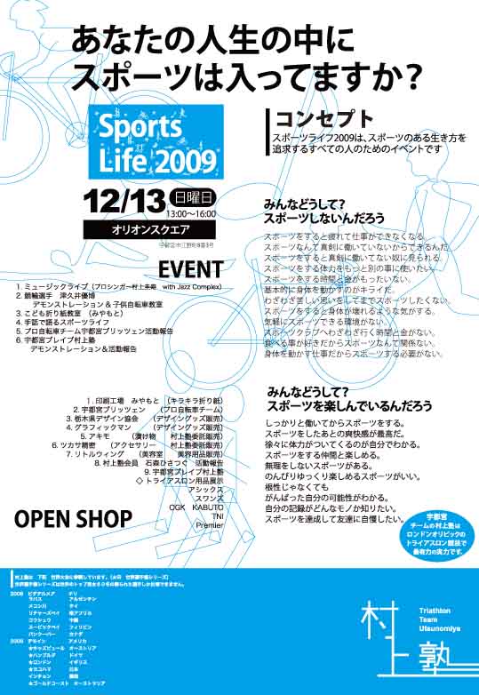 お待たせしました!!毎年恒例の村上塾のシーズン報告会兼忘年会、今年はSPORTSLIFEというイベントで、にぎやかに、行ないます。