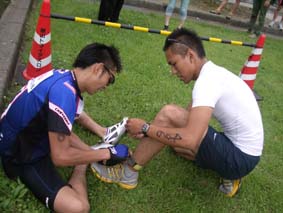 リレーといっても「タイミングチップ」がタスキ代わりです。タイミングチップの交換も真剣そのもの!