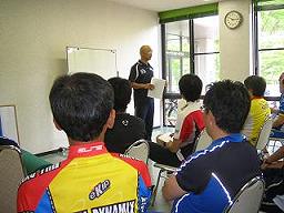 最初に村上コーチの講習。トレーニング理論、体の使い方、パワーポイントのお話など、図入りでじっくり説明していただきました。皆さん少し緊張気味で聞いてますね。。。